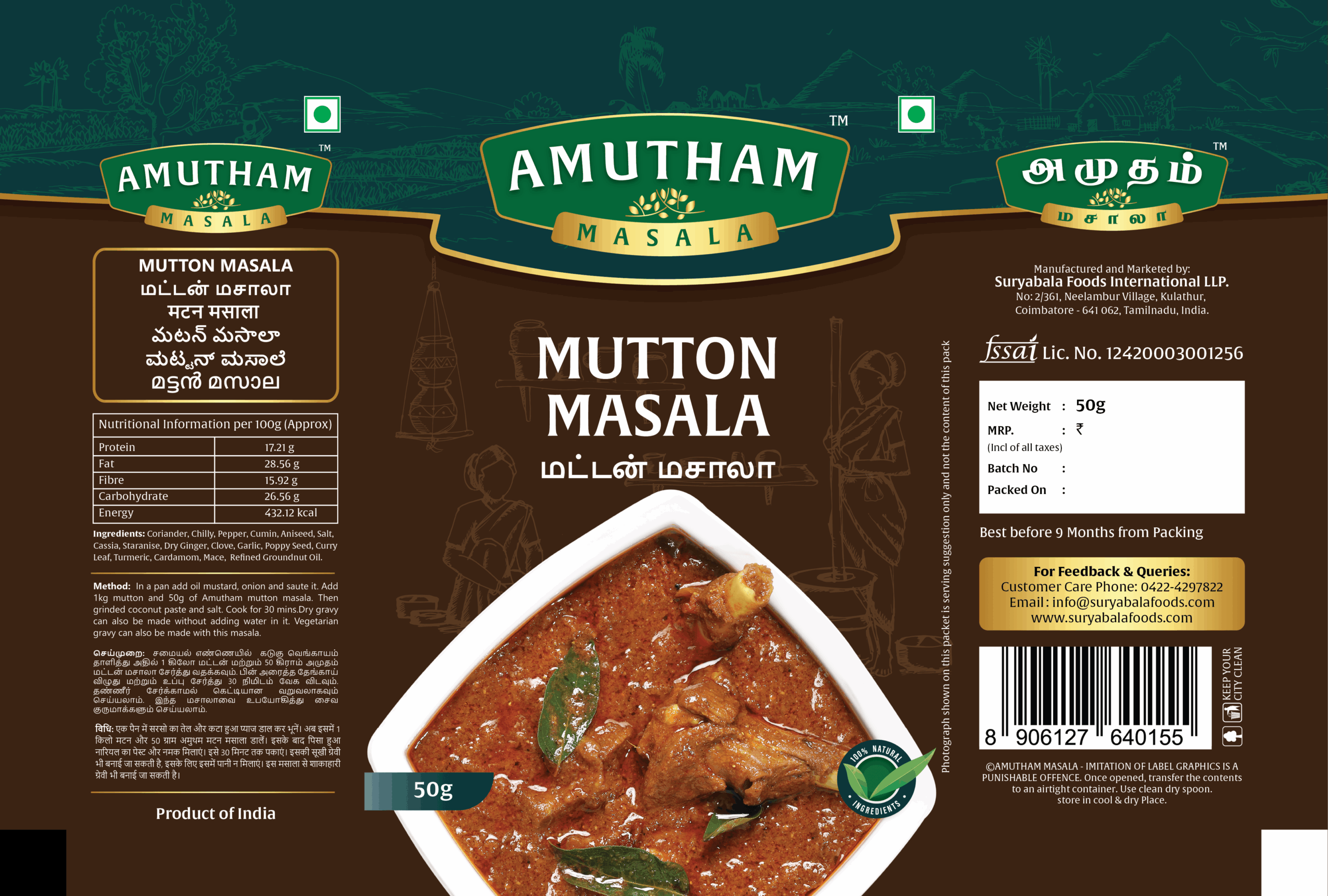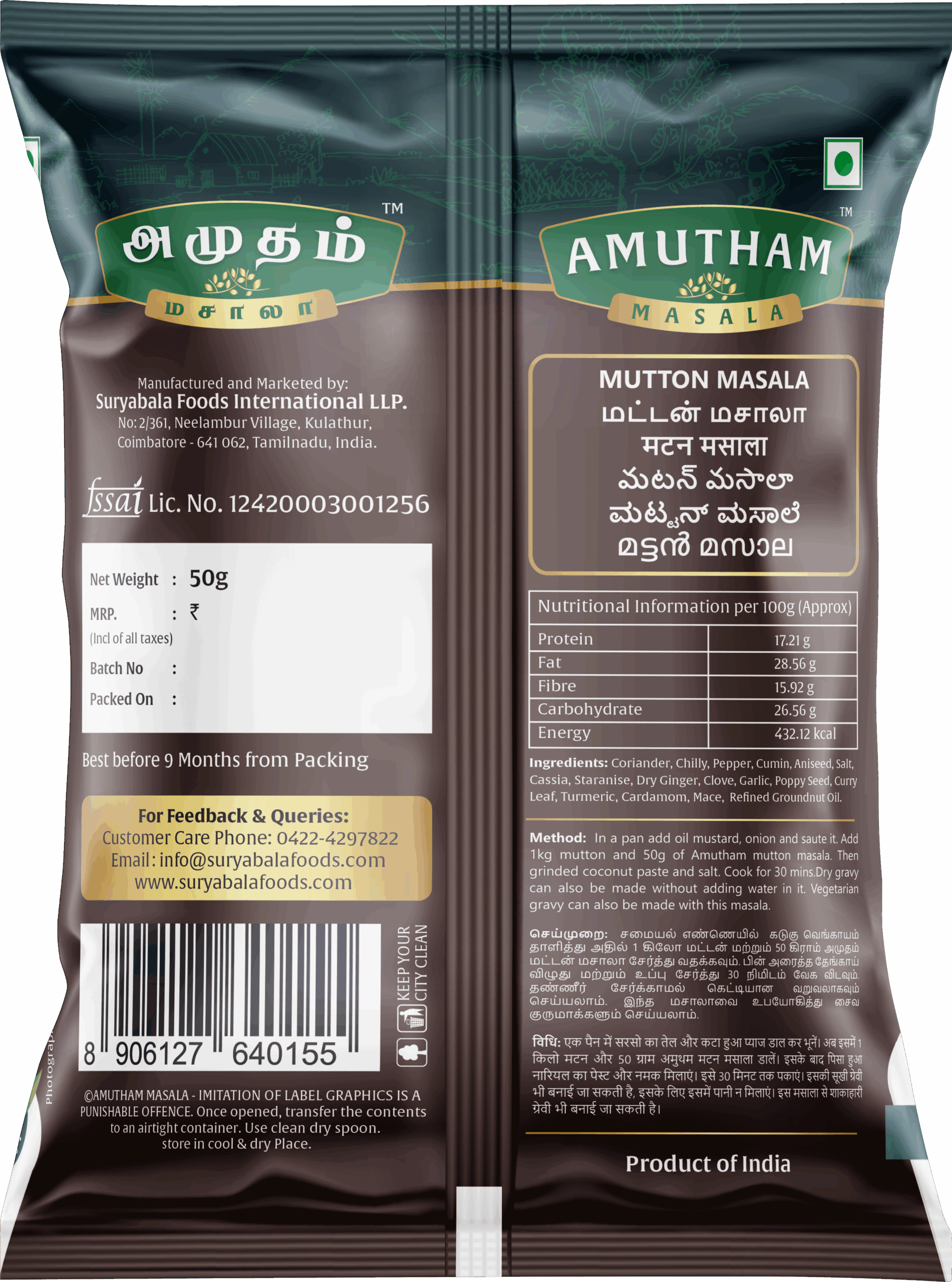 | Ingredients | Pepper, Cumin, Coriander, Dry Ginger, Chilly, Aniseed, Turmeric, Salt, Mace, Refined Groundnut Oil, Poppy Seed, Cassia, Clove, Cardamom, Garlic, Curry Leaf, Staranise |