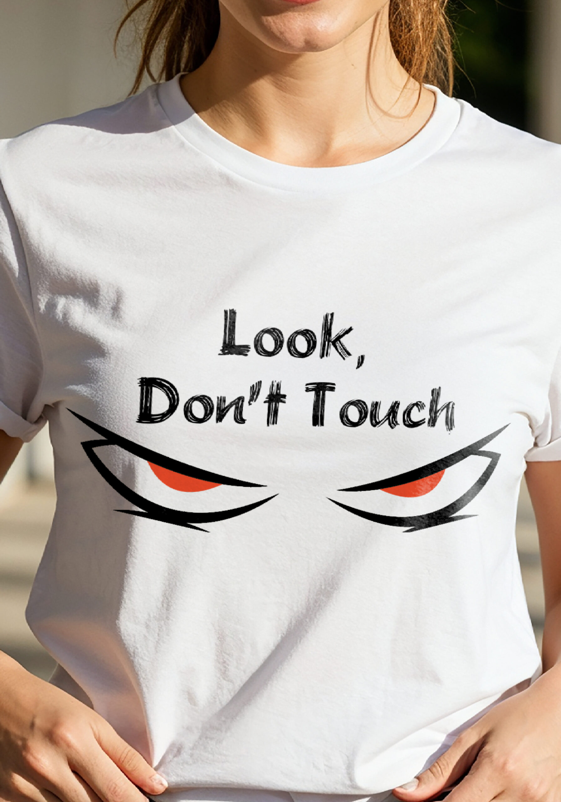 Our Look, Don’t Touch T-shirt is made from soft, premium cotton for all-day comfort. Featuring striking eye graphics and a confident caption, it’s perfect for those who love attention but keep the rules their own. Pair it with jeans, shorts, or a leather jacket and let the shirt do the talking.