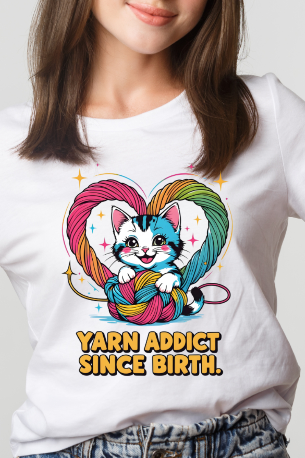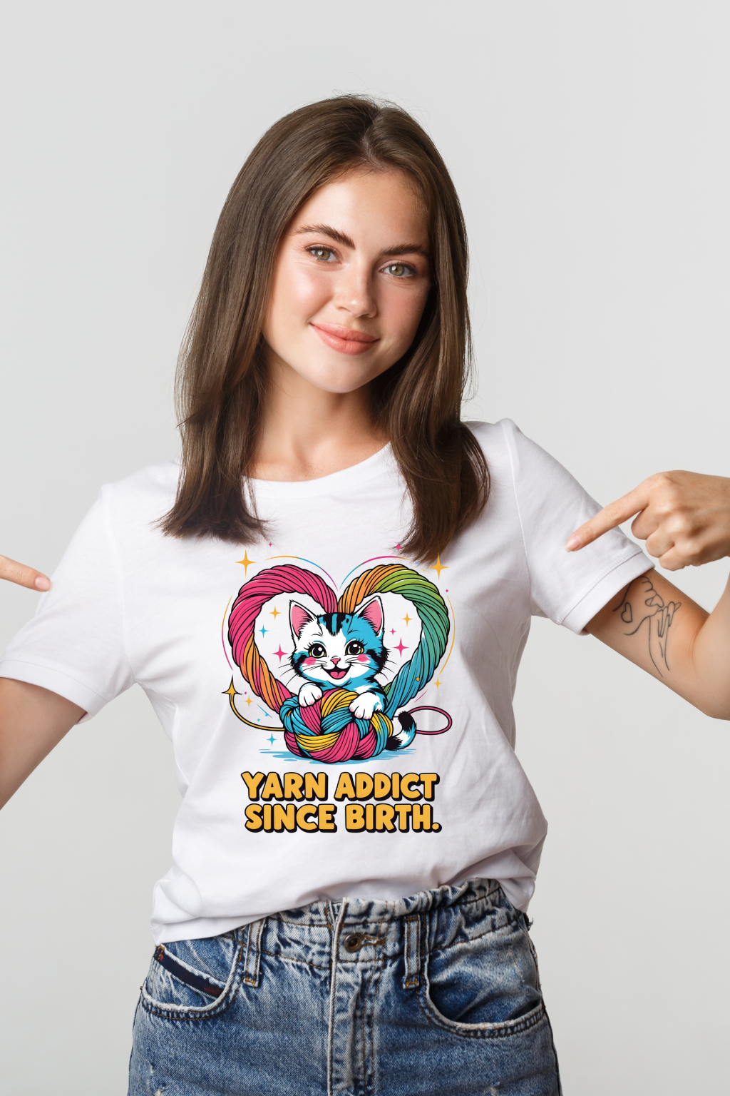Celebrate your love for cats and cozy vibes with our Yarn Addict Since Born T-shirt.